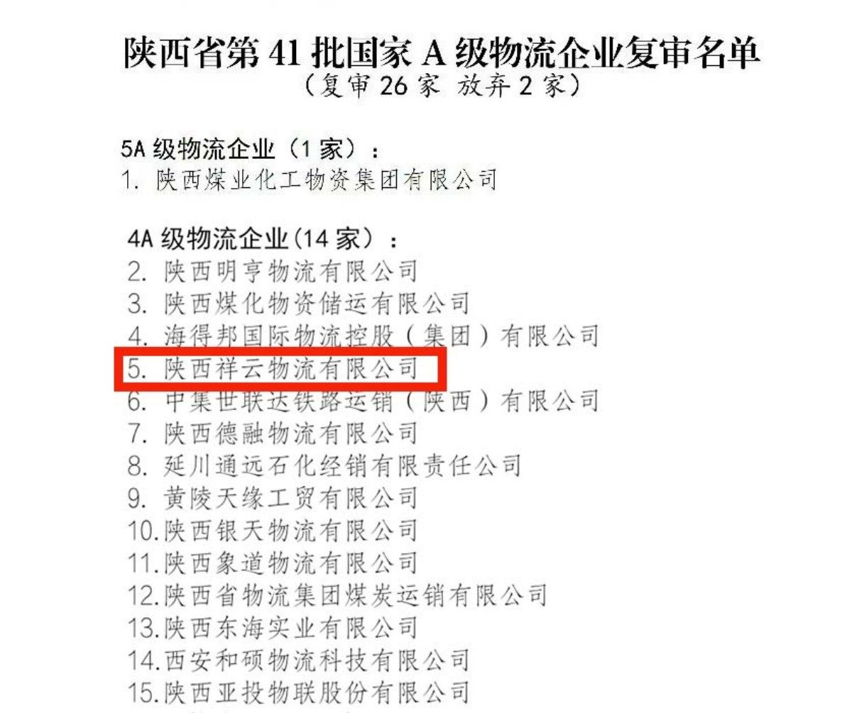 2026年2月,经中国物流与采购联合会、陕西省物流与采购联合会评估审核,陕西祥云物流有限公司顺利通过国家4A级物流企业复审认定!