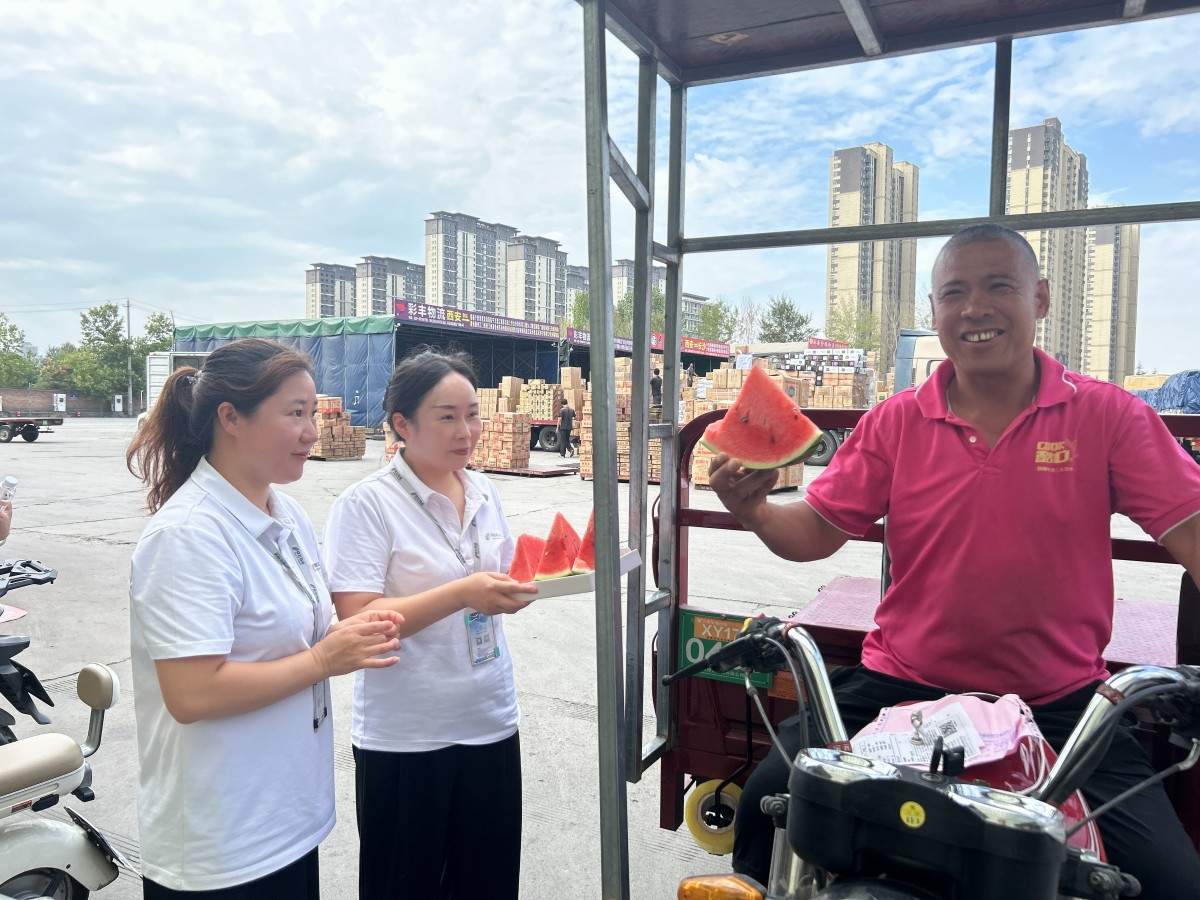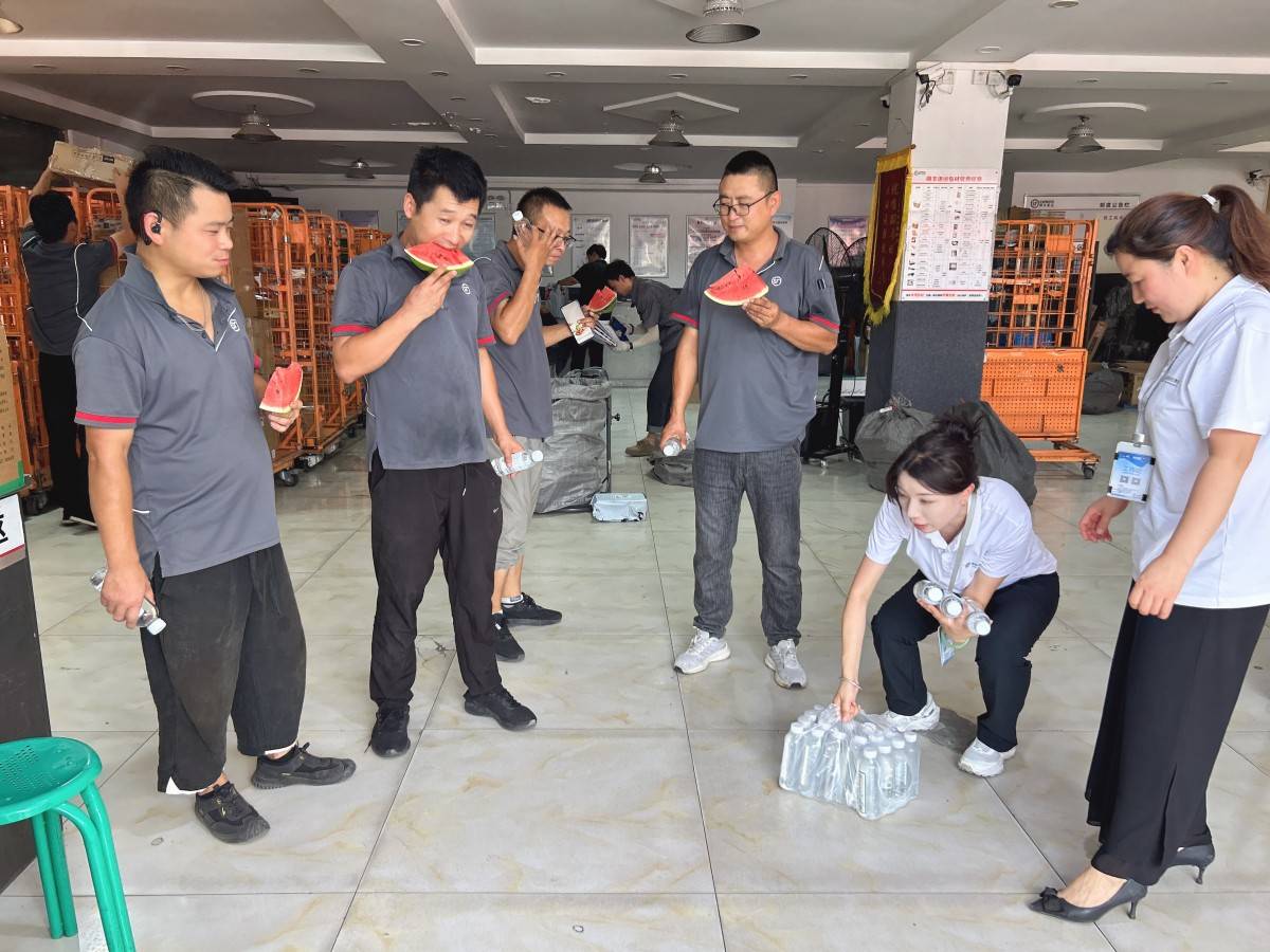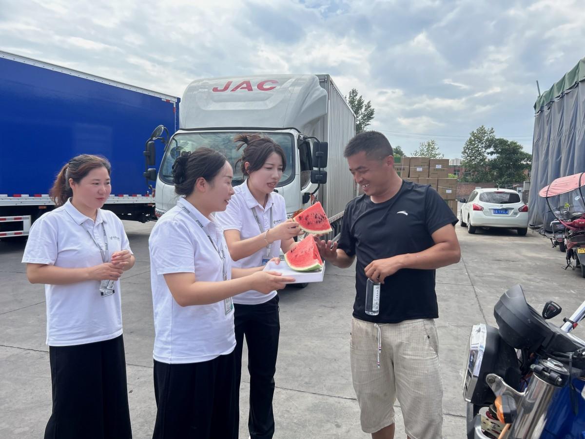 慰问组顶着烈日穿梭在园区中,将矿泉水、饱满多汁的西瓜以及红牛饮品送到商户、装卸工和各式车辆司机手中,他们脸上都露出了欣慰的笑容。“天这么热,干活一会儿就一身汗,园区送的水和西瓜太解渴了,还有红牛能提神,真是送到了我们心坎里,为祥云物流点赞!”一位正在卸货的工人擦着汗说道。这一份份承载着公司关爱的防暑降温物资,如同炎热中的“及时雨”,有效缓解了一线工作人员的暑热疲惫,更让大家深切感受到了公司的贴心守护。